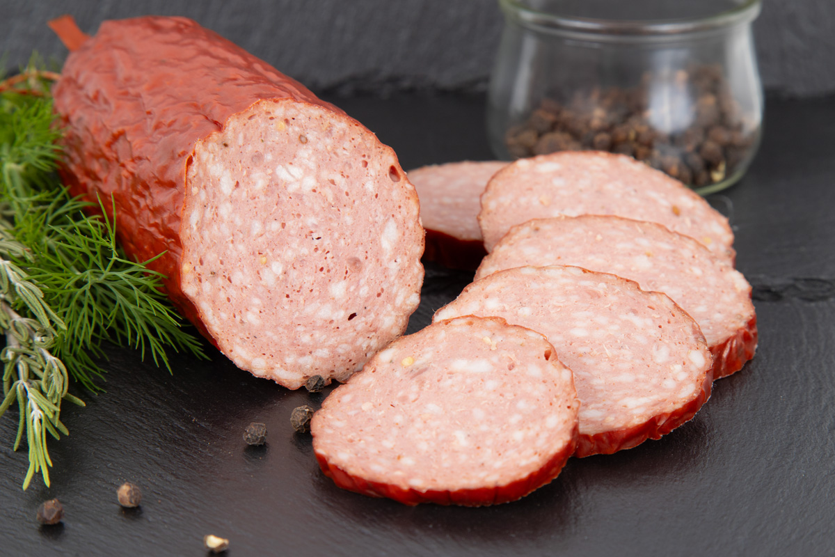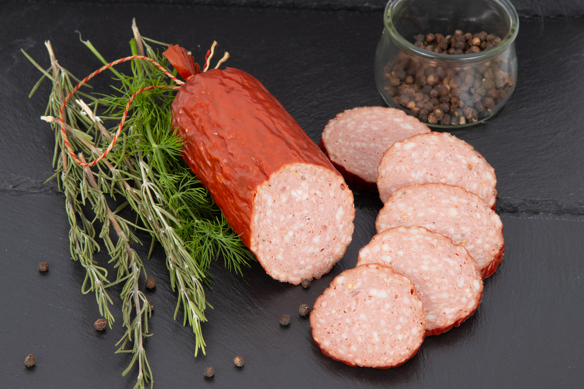 Echt Laucherttaler Wild-Schinkenwurst nach unserem traditionellen Rezept in Buchenholz geräuchert.